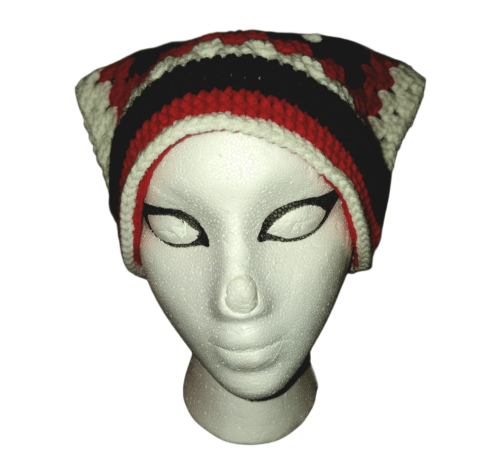 "Harlequin" jester style beanie with painted jingle bells, handmade with comics in mind using acrylic yarn. Roughly 22 inches around and 7 inches from crown to edge of brim, should fit most average female heads